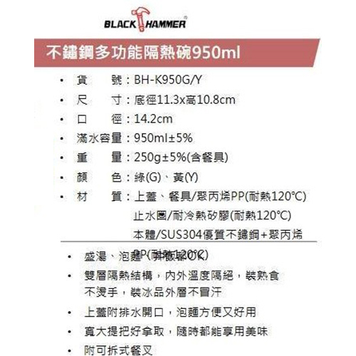 商品名稱 : 鏽鋼多功能隔熱碗950ml