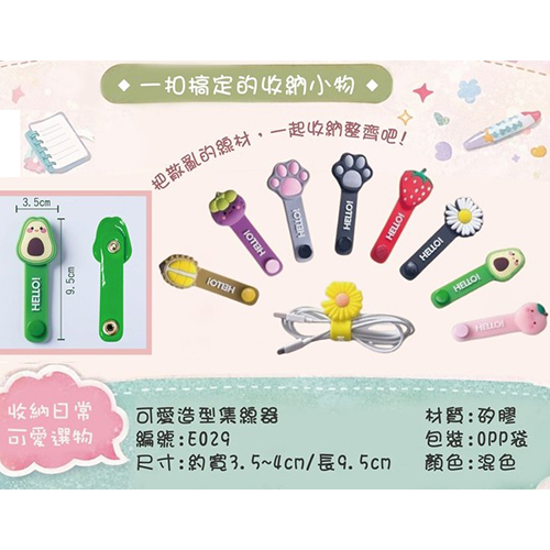 商品名稱 : 可愛造型集線器 商品編號 : 127-E029 商品規格 : 約寬3.5~4cn/長9.5cn 商品材質 : 矽膠 商品包裝 : OPP袋 商品顏色 : 混色 商品特色 : ‧螢幕顯示各有差異,實際顏色以實品為主 ‧商品圖片僅供參考,實際規格以出貨實品為主 商品介紹 : ‧歡迎洽詢電話 : 04-7756767